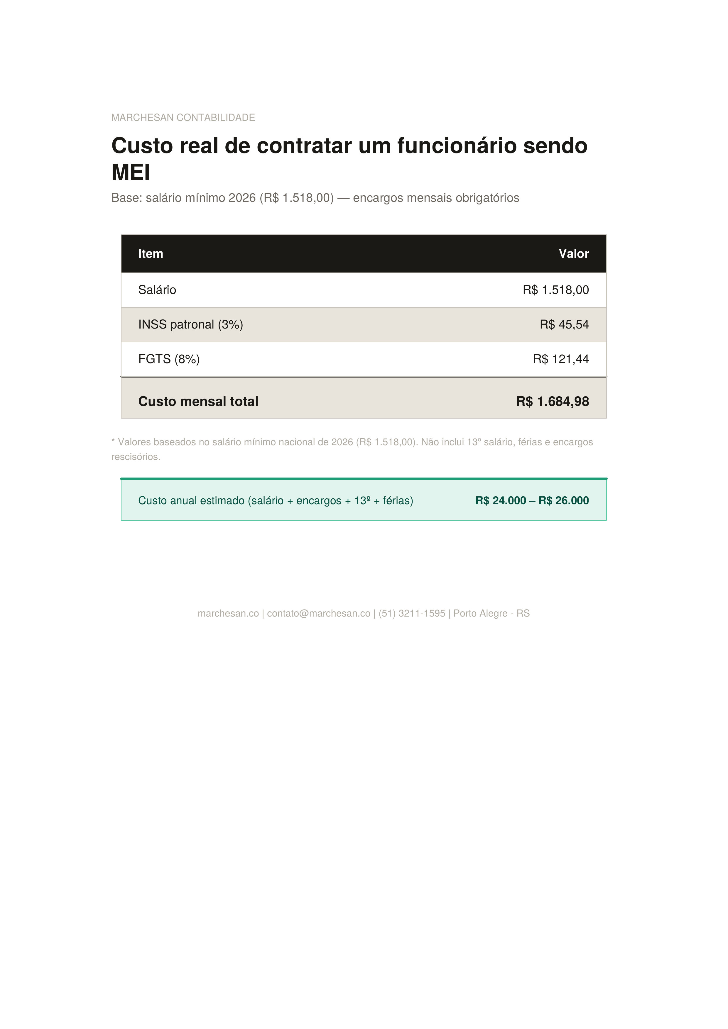 Dica prática: antes de contratar, calcule o custo real anual do funcionário, salário, encargos, 13º e férias. Para um salário mínimo, o custo total anual fica em torno de R$ 24.000 a R$ 26.000. Tenha certeza de que o negócio comporta esse compromisso fixo.